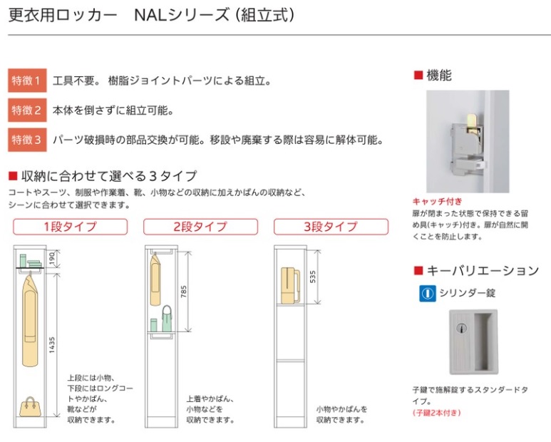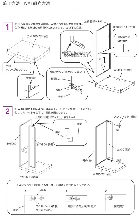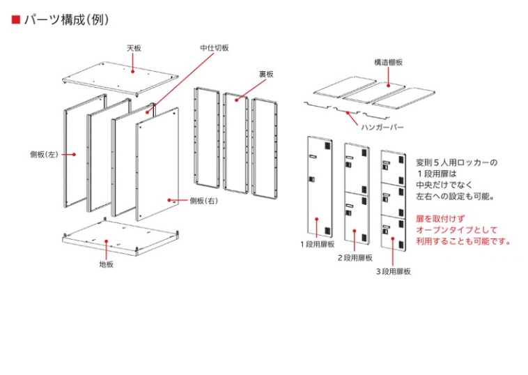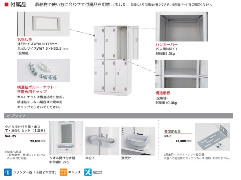 | ■付属品 | 名指し枠、横連結ボルト、ナット、穴埋め用キャップ(ボルトナットは横連結時に使用。横連結をしない場合は穴埋め用キャップでふさいでください。)、ハンガーバー、構造棚板(耐荷重:10kg) |