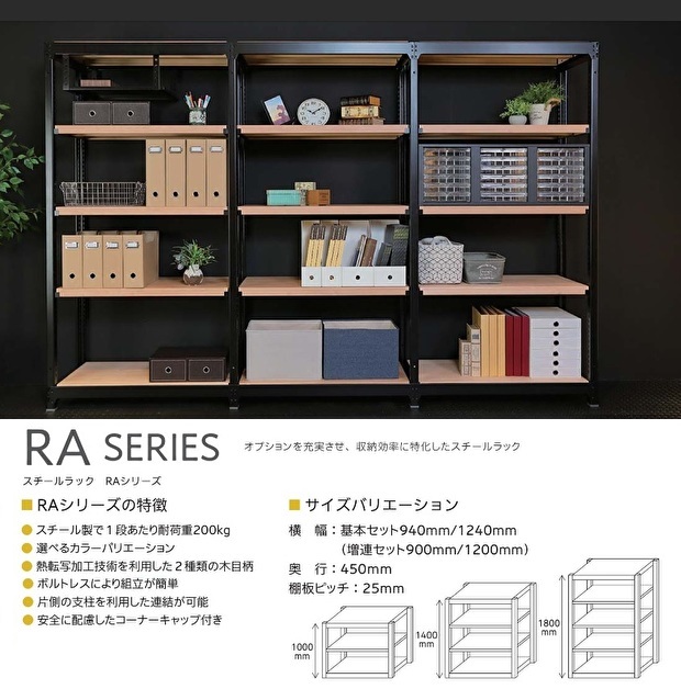 スチールラック 基本セット フレーム:ブラック、棚板:ナチュラル RA-9010-B-NT 幅940×奥行450×高さ1000mm